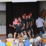 梅雨の晴れ間の誕生会。今回の出し物はモーニング娘の歌う「ひょっこりひょうたん島」に合わせて行事担当6名がダンスを披露しました。飛び入りも加わったアンコールはエグザイルかと思われるパフォーマンスで「二度目はじょじなったが」と好評を博しました。